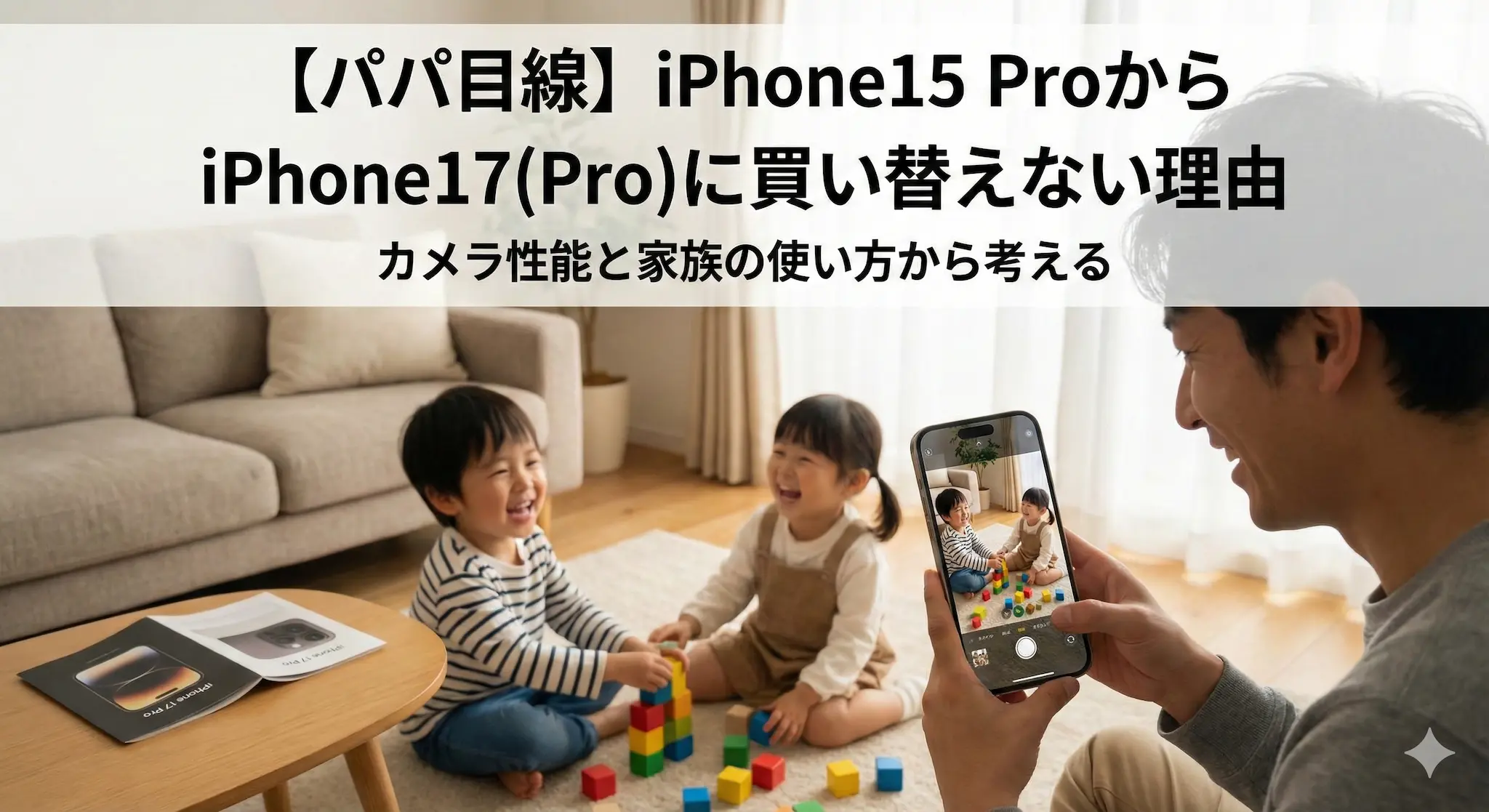 毎年新しいiPhoneが出るとワクワクするものの、今回は冷静に「見送り」を選択しました。特にパパとして重視している カメラ性能 や、祖父母とのテレビ通話など「家族との使い方」を考えると、15 Proでまだ十分だと判断したからです。